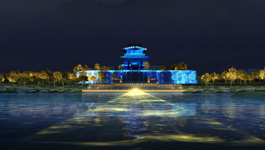 效果呈现:当蓝金色的光影从建筑流淌到水幕,半透明的水幕让光影更具层次,仿佛千年历史从城墙上"流”进了湖面,观众的视线被自然引导,从建筑延伸到水面,空间感瞬间被放大。