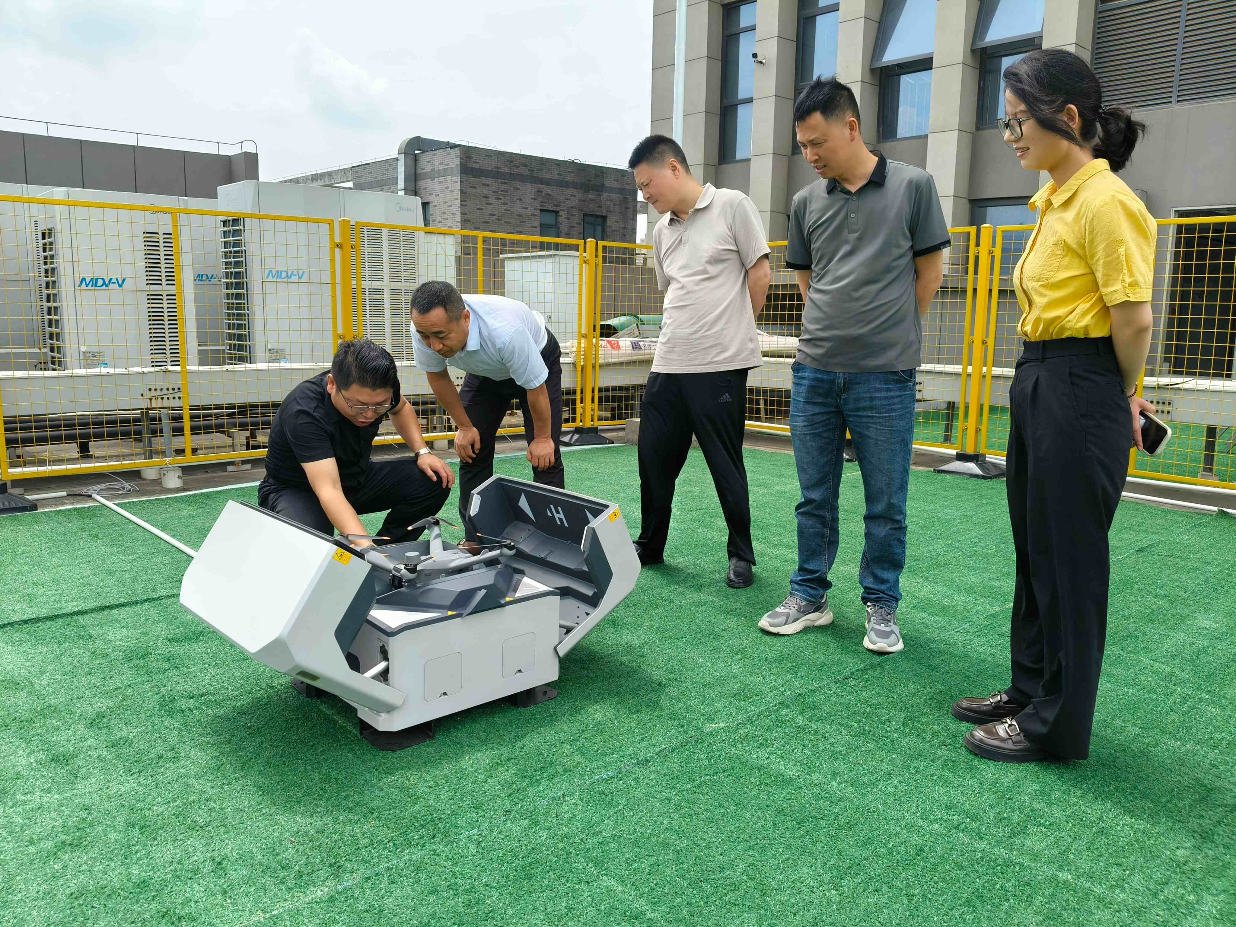随后,在汉思科技集团董事长何庆亮以及辛卫兵秘书长的陪同下,常务副校长杨德明、副校长王泽焕和副校长孙敏一行参观了公司位于五楼的无人机低空阵列区域,实地考察了公司的业务范围和技术实力。