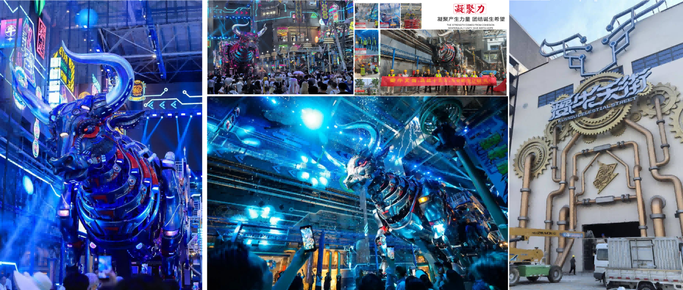 淮北夔牛天街位于相山区濉溪路与惠黎路交汇的核心地段,原址是承载三代人记忆的老大唐发电厂。项目以“工业文化+科技体验”为核心,融合工业博物馆、主题商业街区和研学教育,打造集潮流零售、文化创意、休闲娱乐于一体的文商旅综合体,建筑面积约1万平方米。天街的标志性IP是以《山海经》夔牛为原型的机械巨兽“雷雷”,全高13米、长21米、重43吨,配备灯光、声效和喷雾装置,成为游客拍照打卡的热点。在这里,游客不仅可以逛潮流店铺、品尝美食,还能通过互动装置和研学活动感受淮北的工业遗产与现代创新的交汇,成为皖北地区新兴的消费与文化地标。